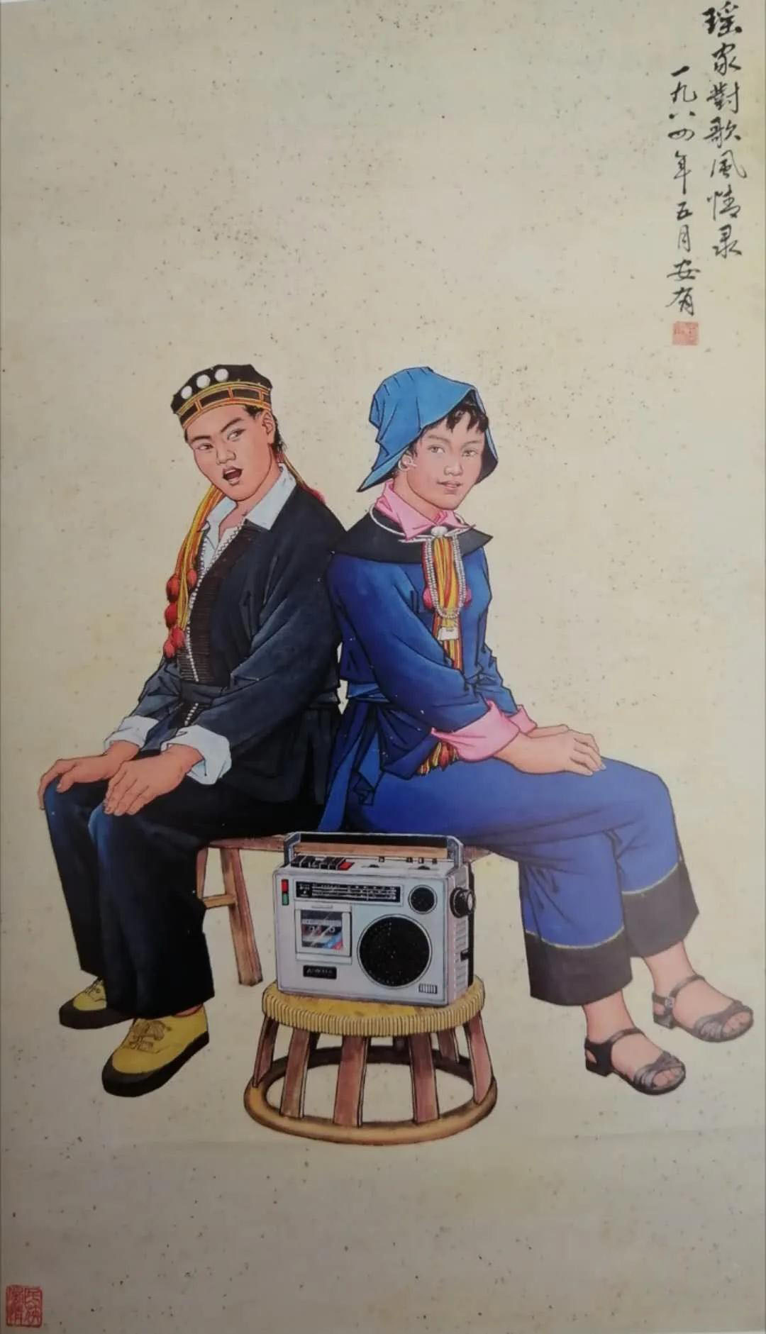 1985年国画《瑶家对歌图》丶《阿波的扎琵节奏》、《鸽棲山茶》丶《口弦声声》丶《花鸟》五件作品入选《锡都书画展》在北京中国美术馆展出。