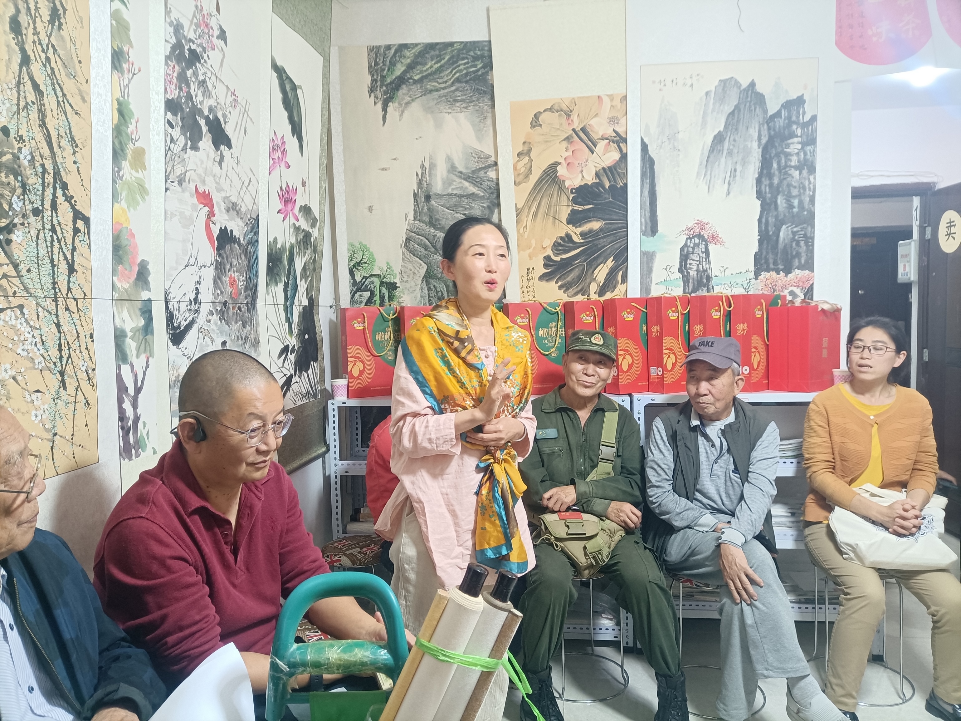 就在这个简陋的家里,美丽的马老师带来了一束漂亮的鲜花,一瞬间充满了春的气息。书画家们脸上洋溢着微笑,心情特别开心,大家一起做起了手指操,敲起了健康小木锤,大家深深感觉到了健康比什么都重要。你看,著名书法家何革明老师在唱歌,著名画家王昆娥老师跳起了孔雀舞。你听,著名画家郑连云老师正在分享故事,果然是小故事大道理。旁边,几位名家老师开口说起了正宗家乡话,俏皮话虽听不懂,但整个房间里面气氛特别融洽。