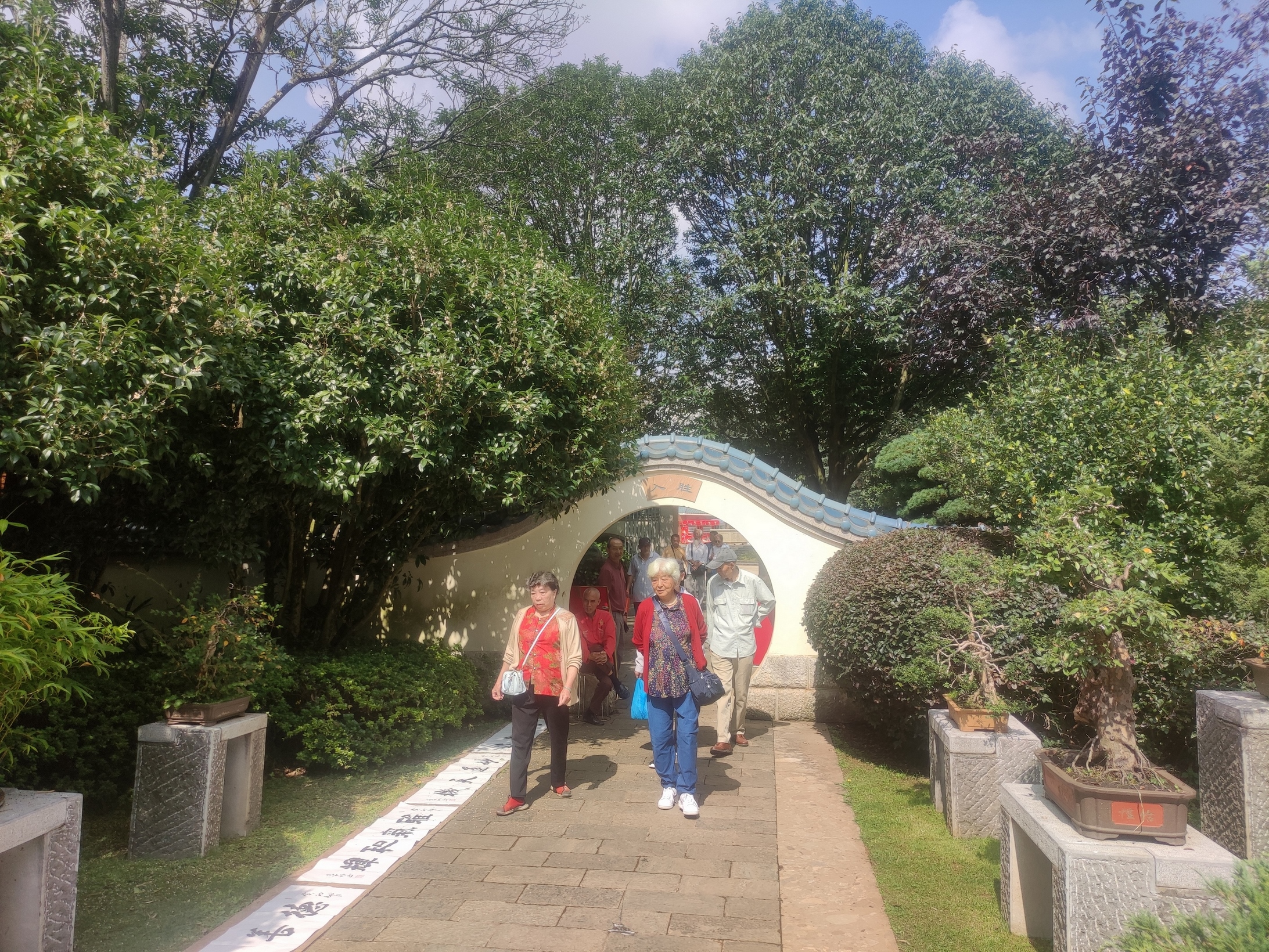 默哀之时,闭上眼睛,清风轻轻吹着。著名书法家杨东升老师,著名书法家卿锡明老师,著名女书画家刘培姑老师,著名书法家曹长生老师,等名家老师们现场挥毫泼墨,写出了一幅幅精美的作品,挂满摆满了整个盆景园。